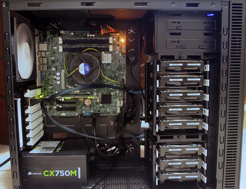 The HTPC box and various computers around the house use a mix of internal drives, external USB and eSATA drives. It is quite a mess, and backups are sporadic at best. The HTPC especially has grown organically with USB and eSATA as it needed more and more space.